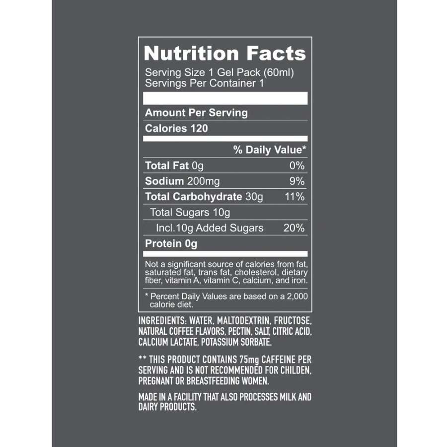 Fuente de hidratos de carbono 2:1 de maltodextrina a fructosa. 30 g de energía de rápida absorción y 75 mg de cafeína por gel. Consistencia más fina que otros geles, por lo que se puede tomar con o sin agua. De sabor suave para minimizar el potencial de problemas gastrointestinales.